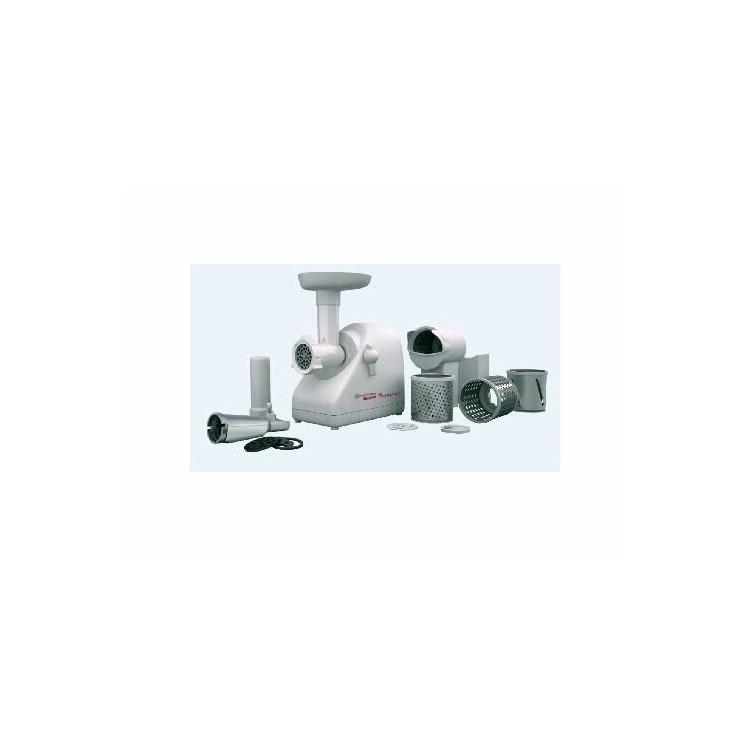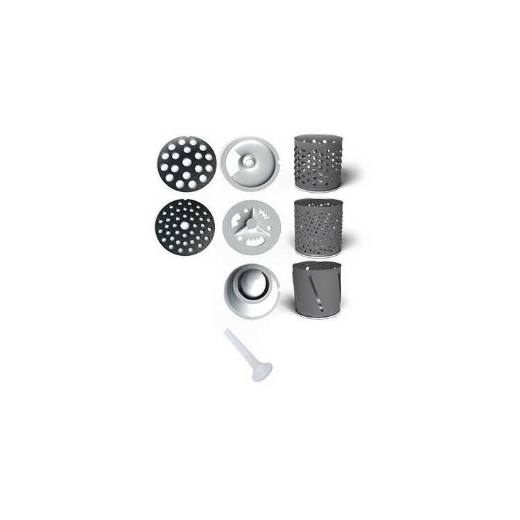 2. Универсальность. В комплекте поставляются насадки для приготовления разнообразных блюд: диски для фарша, насадки для колбас, шинковки и терок.