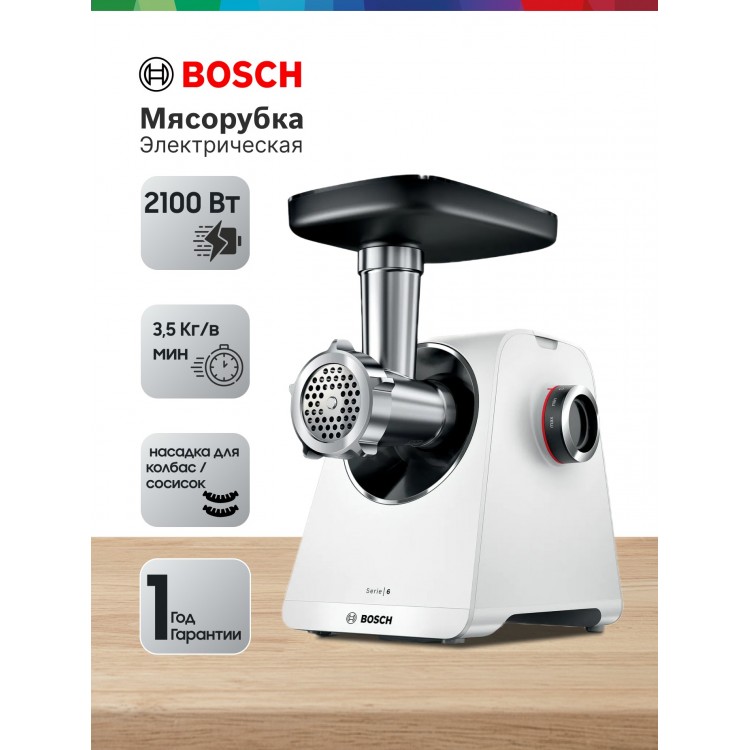 | Название | Мясорубка Bosch Series 6 MFWS607W, с насадками для колбас и кеббе |