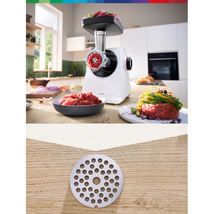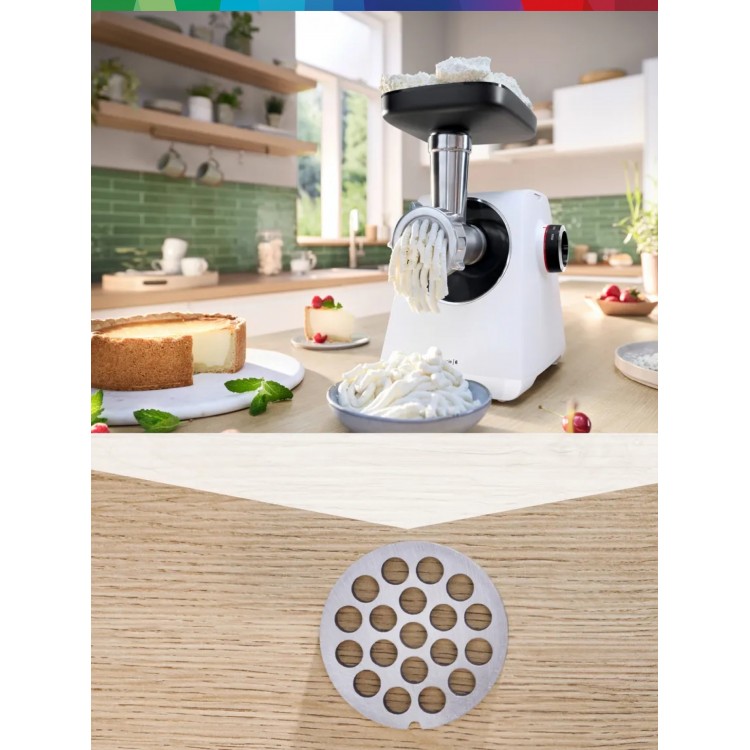 Прорезиненные ножки и отсек для сетевого шнура обеспечивают устойчивость и удобство хранения. Мясорубка Bosch Series 6 MFWS607W выполнена из надёжных материалов: пластика и металла. В комплекте вы найдёте не только диск для фарша, но и насадку для кеббе и насадку для приготовления колбас.