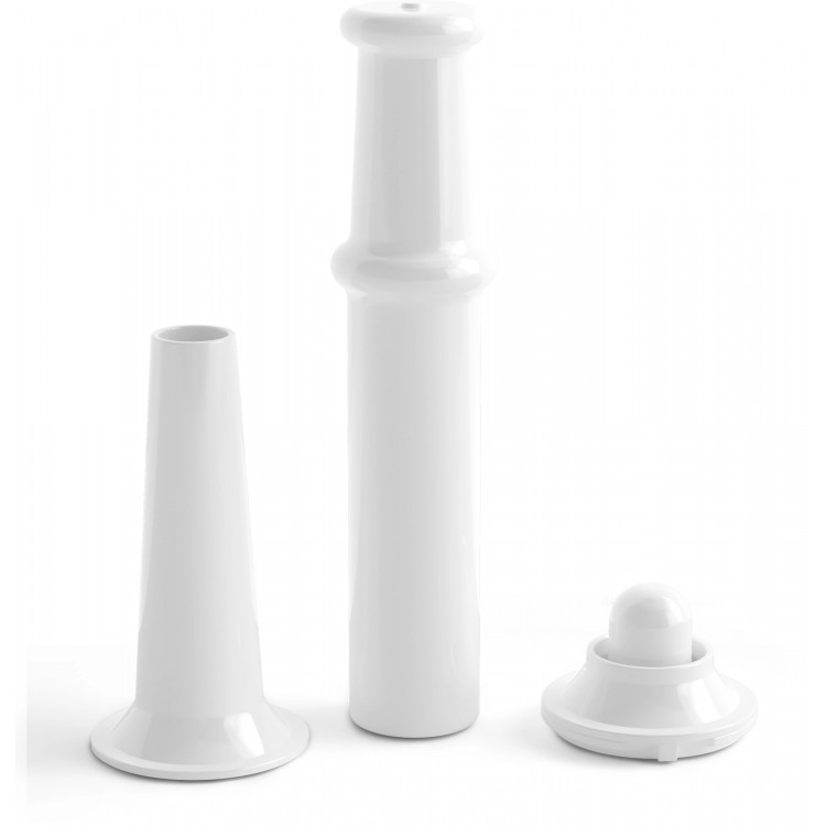 Мясорубка выполнена из пластика и металла, что обеспечивает долговечность и прочность. Алюминий, из которого изготовлены нож и шнек, гарантирует остроту и долговечность лезвий. Насадка для кеббе позволит разнообразить ваше меню.