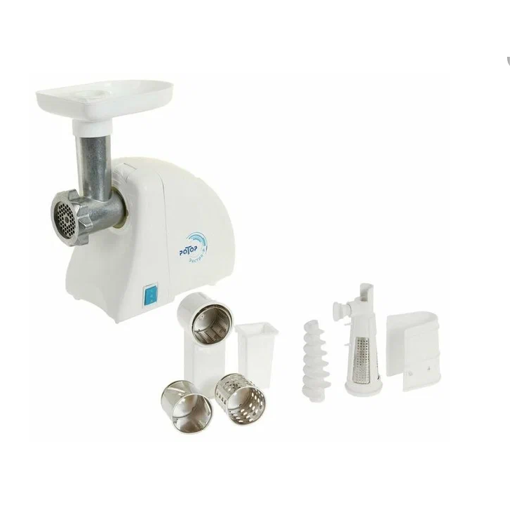 Электромясорубка вполне достойная. Имеется три насадки для овощей, насадка для прокручивания мяса и ещё чего либо и соковыжималка . Была ранее подобная в ней устраивало всё, называлась РОТОР " Дива ".