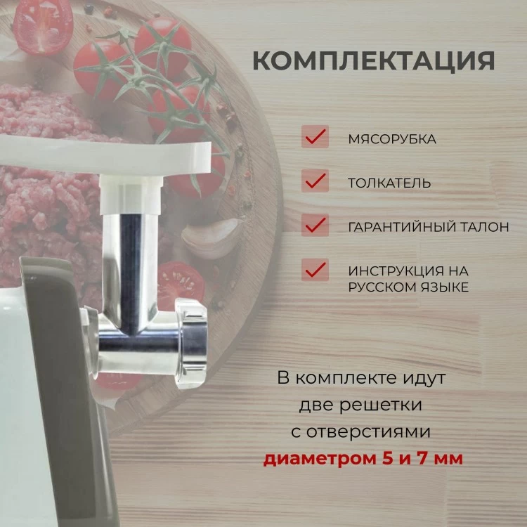 Производительность мясорубки составляет 1,5 кг/мин, что позволит вам быстро и эффективно перемалывать мясо для ваших кулинарных шедевров.