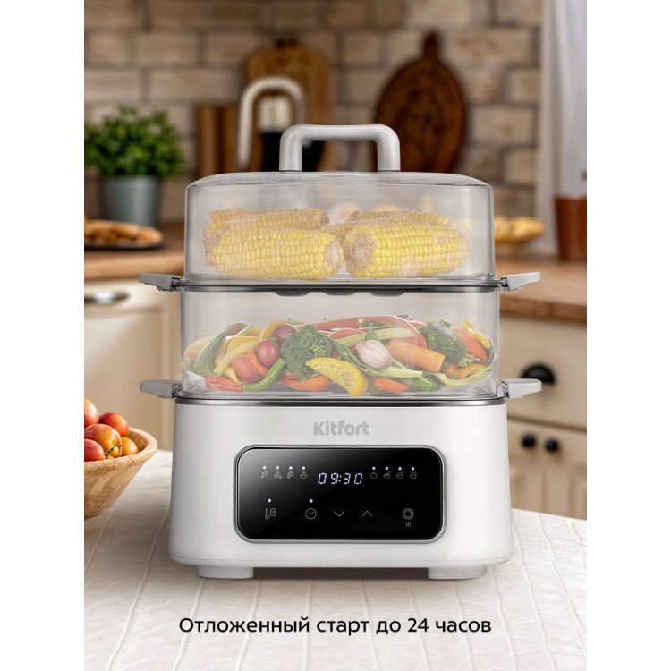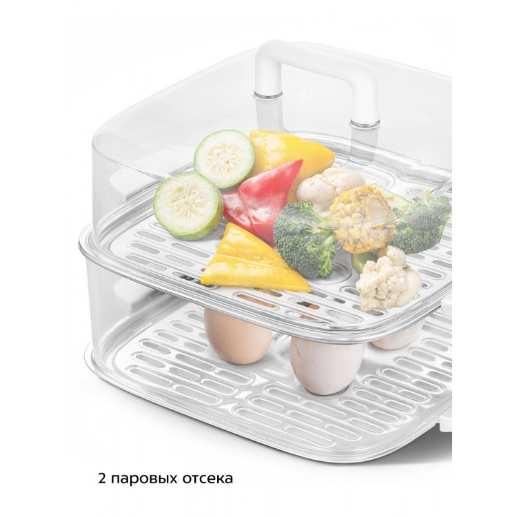 Отличная пароварка. Большой резервуар для воды позволяет работать ей 70 минут без остановки, что более чем достаточно для готовки любых продуктов, не бояюсь, что воды не хватит. 2 яруса позволяет готовить разные продукты, требующие разное время приготовления, одновременно. В целом интуитивно понятно и сенсорное меню.