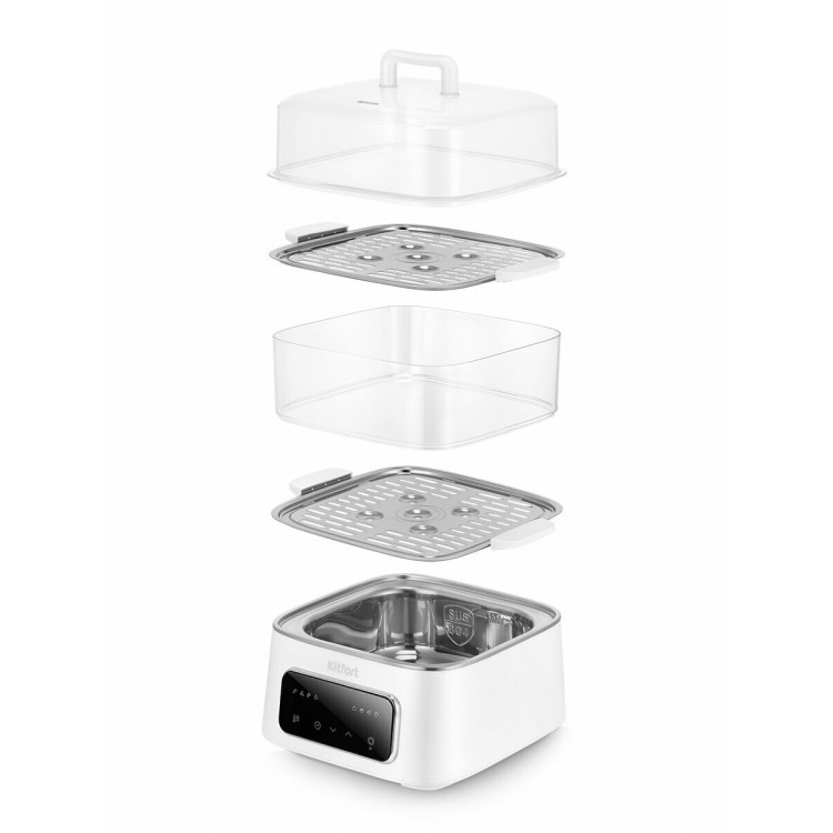 Не очень удобны сами отделения, лучше бы они были в виде лотков, жаль не посмотрела перед покупкой на это, скорей остановилась бы на другой модели. Инструкция понятная, хорошая, ещё и пара рецептов внутри. Воды наливать до максимума не советую - будет брызгать на нижний уровень. В целом покупкой довольна, но есть нюансы. От этой фирмы технику беру впервые, но, думаю, не в последний раз.
