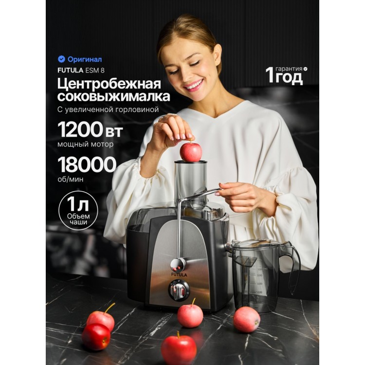 Тип соковыжималки: Центрифужная. Мощность (Вт): 800. Кол-во скоростей: 2. Загрузка целых овощей и фруктов. Цвет корпуса: черный/металлик
