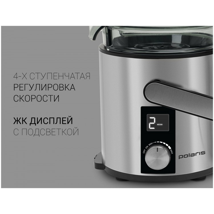 Имеется четыре скорости на выбор, я правда пользуюсь двумя, этого вполне достаточно, чтобы переработать мягкие и твёрдые фрукты. Мякоть выбрасывает автоматически.