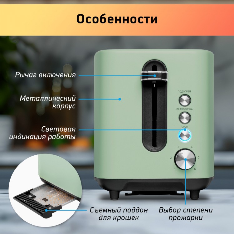 В комплекте с тостером идёт поддон для крошек, что делает его использование ещё более комфортным. Материал корпуса — металл и пластик, что гарантирует долговечность и надёжность устройства.