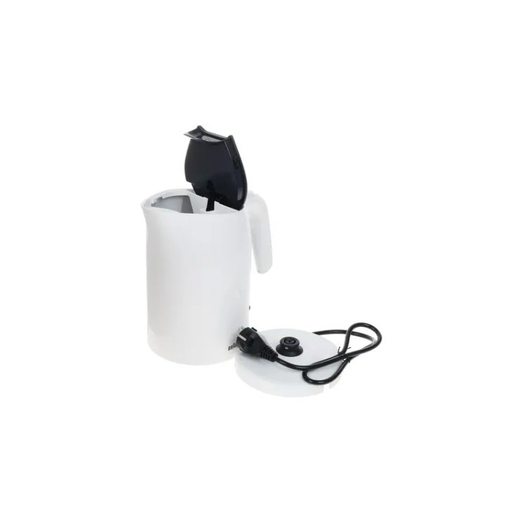 Стильный. Широкий носик позволяет наполнять не открывая. Нормальный по длине шнур. Отключается без щелчков. Не пахнет пластмассой.