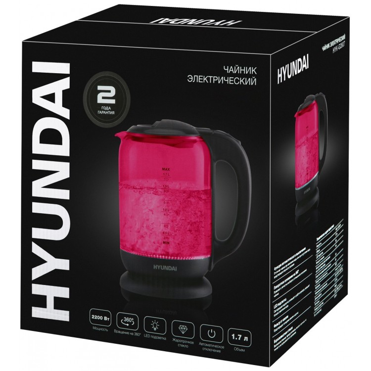 | Дополнительная информация | Чайник электрический Hyundai HYK-G4808 2200 Вт чёрный малиновый 1.8 л стекло |