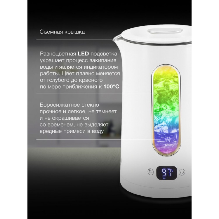 Очень красивый дизайн чайника. Красивая яркая подсветка, удобная ручка, съёмная крышка, удобно заливать воду.