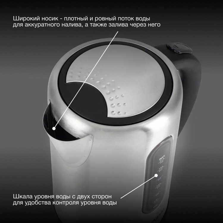 | Особенности | индикатор уровня воды, Вращение подставки на 360°, Крышка открывается на 75° для удобства заполнения и/или очистки чайника. Съемный фильтр от накипи, Фильтр от накипи, шкала уровня воды с указанием количества чашек с двух сторон для удобства |
