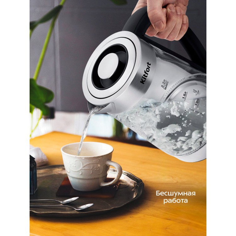 Чайник почти бесшумный с приятной для глаза подсветкой. Удобная съёмная крышка на широкой горловине добавляет комфорта.