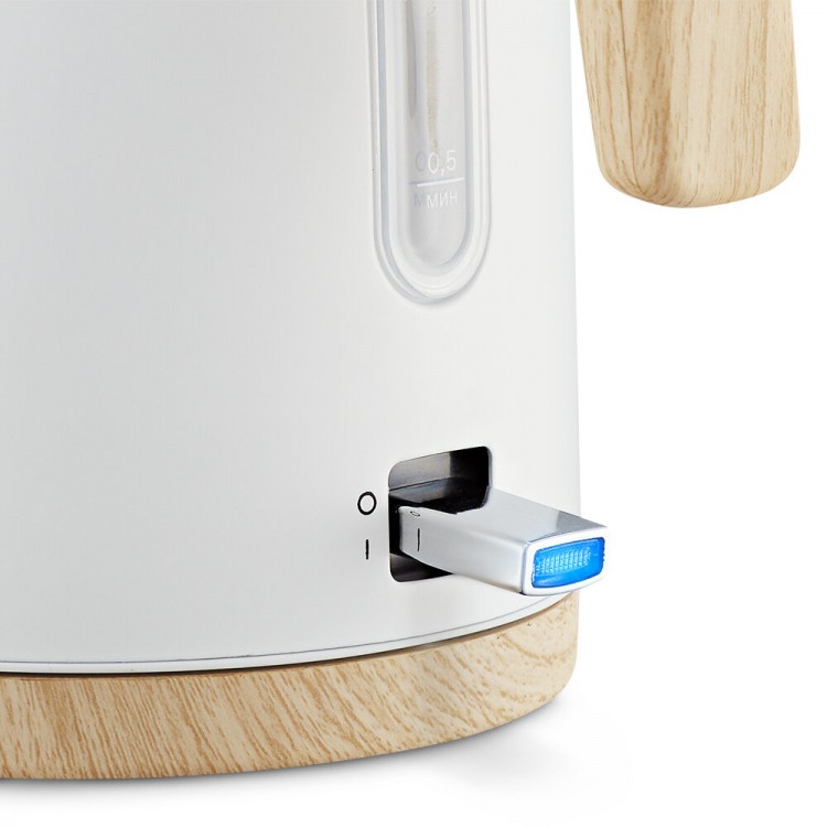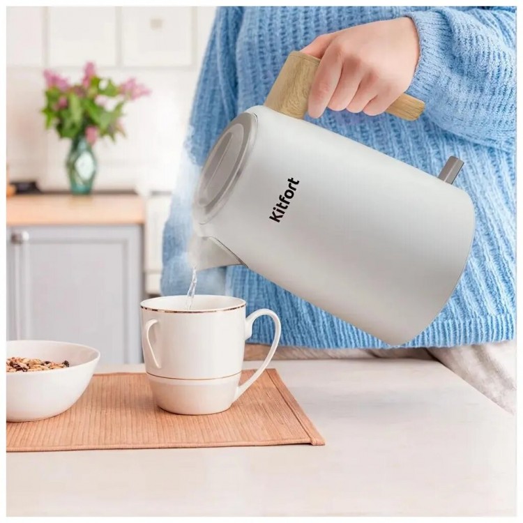 Чайник Kitfort KT-6794 радует стильным дизайном: матовая поверхность и текстура под дерево идеально вписываются в интерьер кухни. Однако ручка, заявленная как деревянная, на самом деле выполнена из пластика, что немного разочаровывает. Несмотря на мощность 2200 Вт, мой старый чайник Vitek на 2000 Вт справляется с кипячением чуть быстрее и работает тише. Уровень шума у KT-6794 средний — не оглушительный, но есть модели и потише. В целом, устройство хорошее, но некоторые заявленные характеристики не совпадают с реальностью.