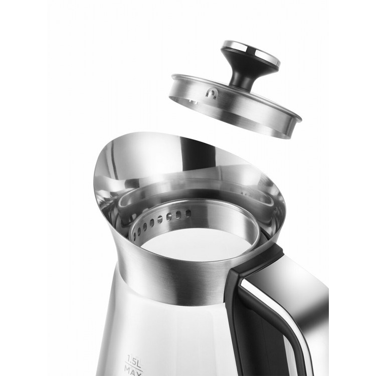 Материал корпуса — металл, стекло и пластик, а колба изготовлена из прочного стекла. Управление чайником осуществляется с помощью сенсорных кнопок.