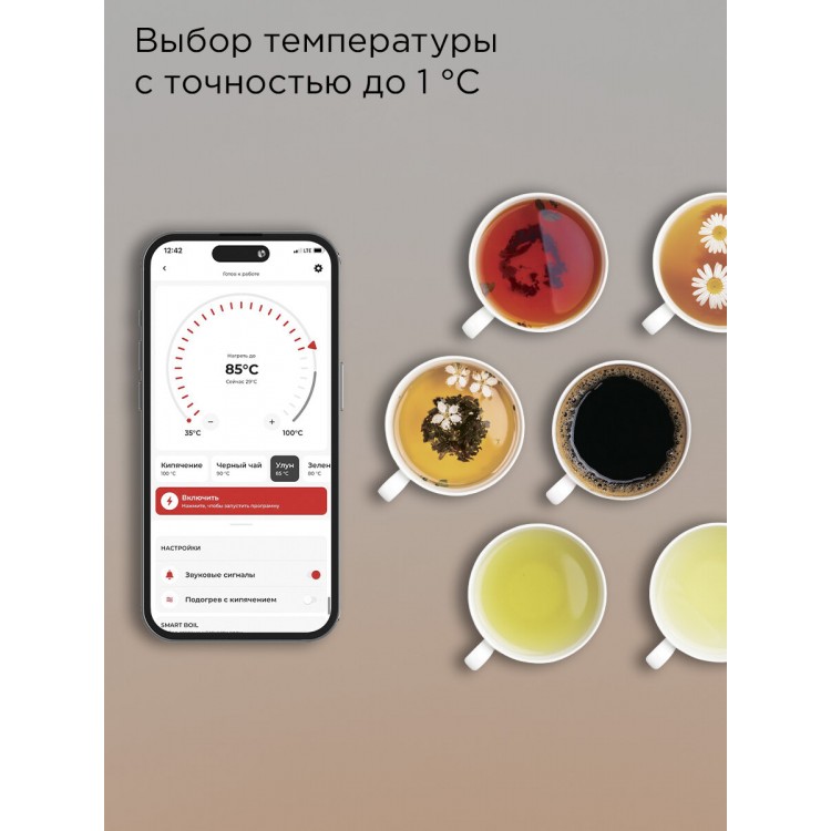Легко подключается к Алисе, быстро кипятит воду и поддерживает выставленную температуру, можно отключать звук