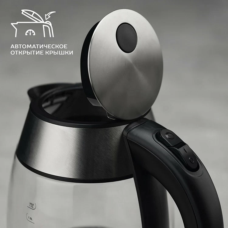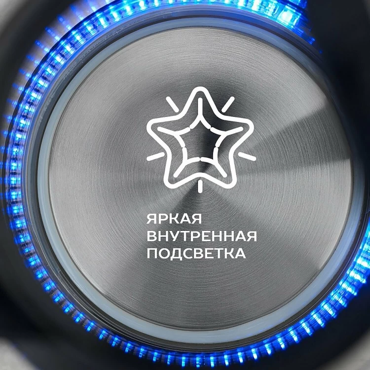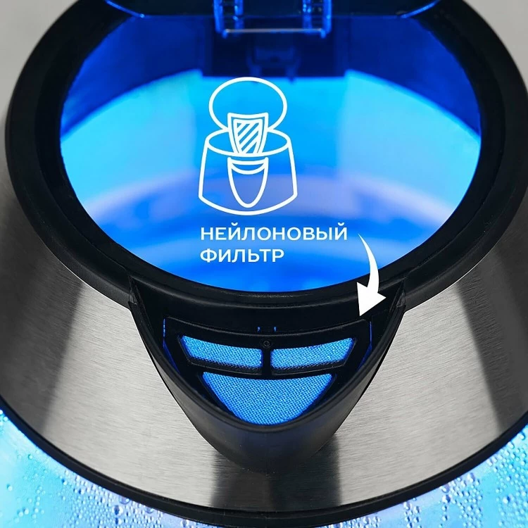 Чайник оснащён блокировкой включения без воды и отключением при снятии с подставки, что обеспечивает безопасность использования.