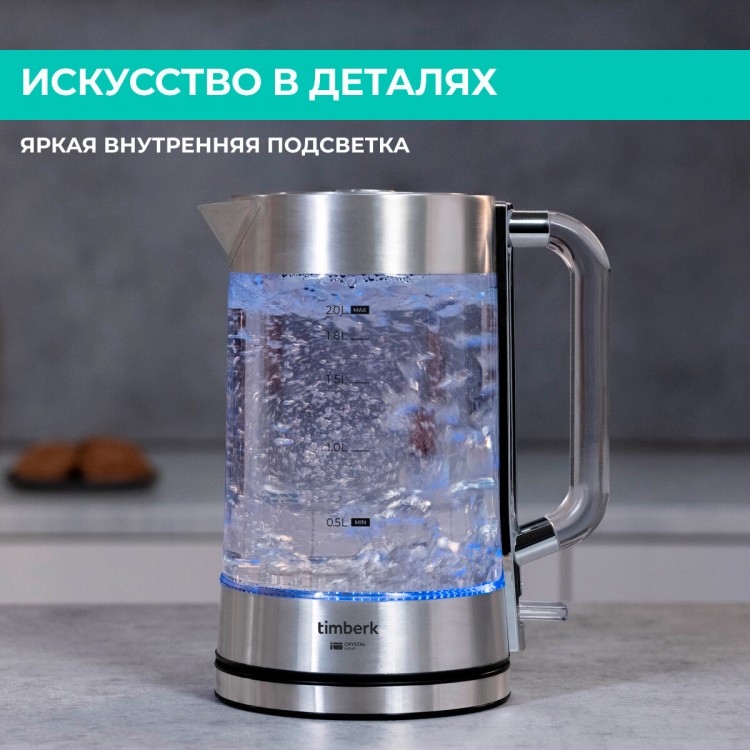 Приобрел на днях такой чайник. Качество сразу понравилось, никакого люфта, сделано хорошо. Высокая мощность, вода закипает быстро. Дизайн серьезный, модный. Ручка не греется, она необычная, прозрачная. Отличный объём два литра. Не протекает, что радует. Подсветка яркая, вечером особо удобно.