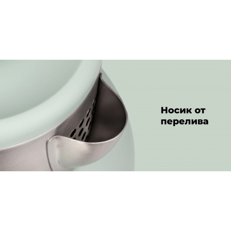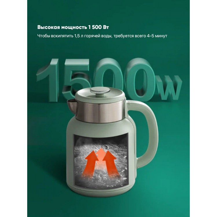 Чайник объёмом 1,5 литра и мощностью 1500 Вт быстро вскипятит воду и поддержит её температуру на нужном уровне. Благодаря закрытому нагревательному элементу из нержавеющей стали и съёмной крышке уход за чайником будет лёгким и приятным.