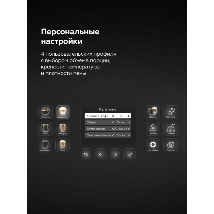 | Настройки | Контроль крепости кофе, Настройка температуры напитка, Предварительное смачивание кофе, Регулировка порции воды, Регулировка степени помола |