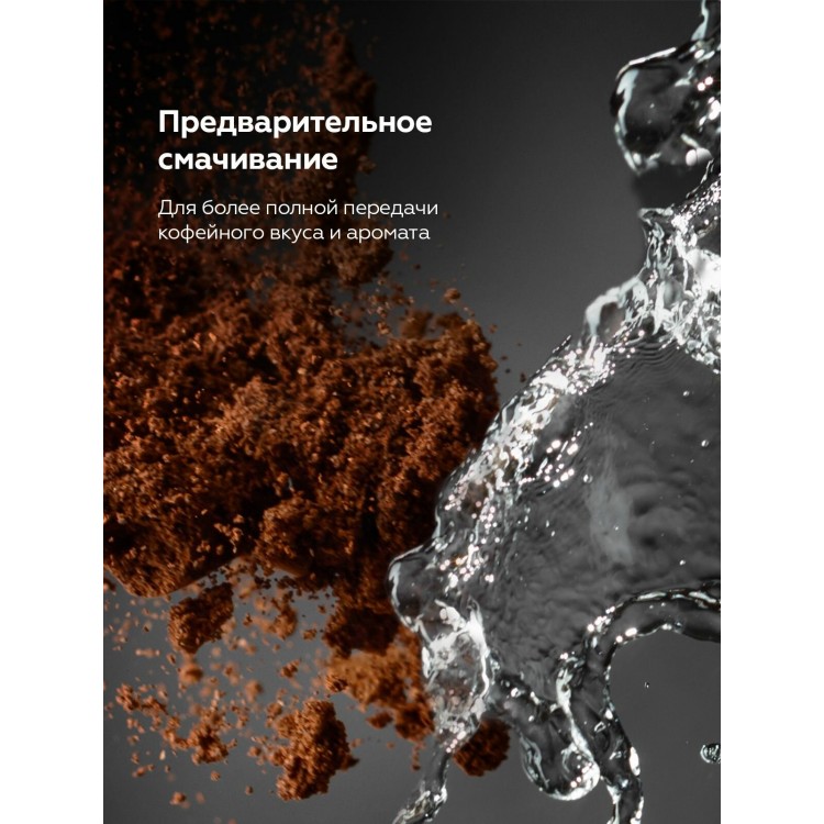 * Настройки: контроль крепости кофе, настройка температуры напитка, предварительное смачивание кофе, регулировка порции воды, регулировка степени помола.