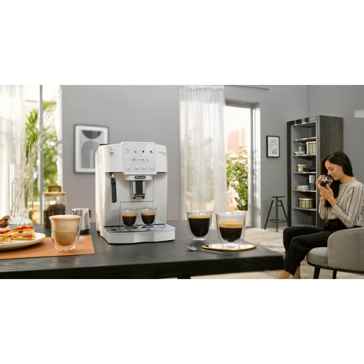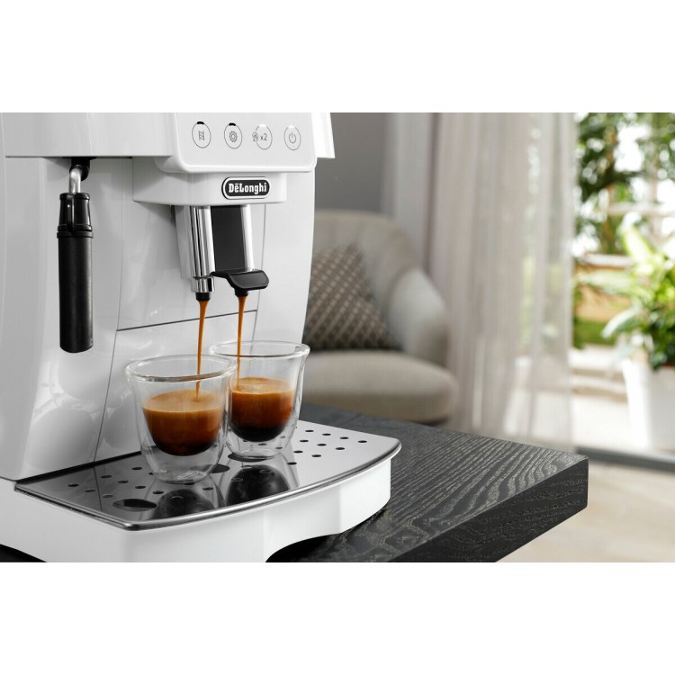 Название Кофемашина De'Longhi Magnifica Start ECAM220.21.WW; Бренд De'Longhi; Цвет товара белый; Тип устройства кофемашина; Тип автоматическая; Количество групп 1; Тип используемого кофе молотый / зерновой; Материал жерновов металл; Мощность 1450 Вт; Объем 1.8 л; Давление помпы 15 бар; Капучинатор есть; Приготовление капучино ручное; Тип напитка американо, капучино, латте, лунго, эспрессо, Молочная пена, доппио, кофе; Дополнительные функции автоматическая декальцинация, одновременное приготовление двух чашек, подогрев чашек, индикатор включения, индикатор отсутствия кофе, индикатор очистки от накипи, регулировка диспенсера по высоте, режим ECO; Настройки крепость кофе, Контроль крепости кофе, Настройка температуры напитка, Поддержание постоянной температуры, Предварительное смачивание кофе, Регулировка степени помола; Тип управления электронное; Фильтр Есть; Материал корпуса пластик; Особенности конструкции дисплей, индикатор уровня воды, индикация отсутствия кофе, контейнер для отходов, Автоматический выбор рецепта, Индикация готовности к работе, Индикация необходимости очистки от накипи, Режим самоочистки, индикатор отсутствия кофе; Встроенная кофемолка есть; Емкость контейнера для зерен 250 г; Регулировка степени помола есть; Количество степеней помола 13; Глубина 42 см; Ширина 22 см; Высота 35 см; Вес 8.8 кг; Срок службы 5 лет; Гарантийный срок 3 г; Цвет белый;
