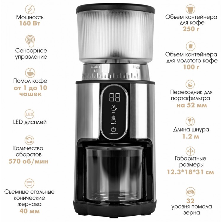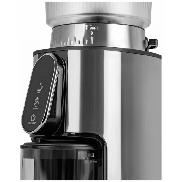 Регулировка степени помола с 32 настройками позволяет выбрать оптимальный вариант для вашего напитка. Наличие счётчика порций и ёмкости для молотого кофе объёмом 100 г добавляет удобства в использовании. Максимальная доза для помола также составляет 250 г, что удобно для приготовления нескольких порций напитка.