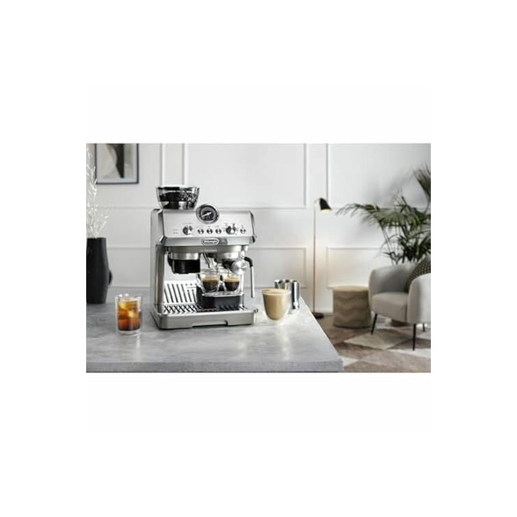 Кофеварка выполнена из металла, что обеспечивает долговечность и прочность конструкции. Стильный серебристый цвет и электронное управление делают её отличным дополнением к любому интерьеру.