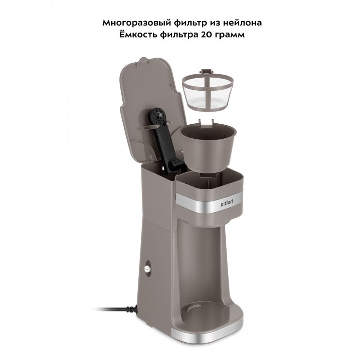 Кофеварка Kitfort — отличный выбор для тех, кто ценит простоту и функциональность в быту. Она радует стильным и компактным дизайном, который легко вписывается даже на маленькую кухню. Готовит напиток достаточно быстро и тихо, а на выходе получается ароматный и горячий кофе без кофейной гущи. Уход за устройством не составляет труда благодаря съемным деталям и качественному материалу корпуса. За свою цену это надежный помощник, который справляется со своими задачами ничуть не хуже более дорогих аналогов.