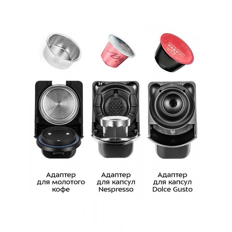 Есть аж три разных адаптера под капсулы Dolce Gusto, Nespresso, а также адаптер для молотого кофе. Пока использовали последние два только;