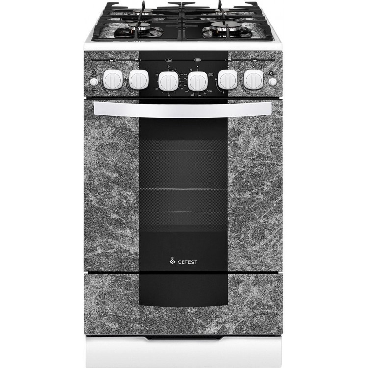 Цвет плиты, конечно не белый, а скорее, черный. Дизайн интересный, красивая получилась плита, все прекрасно работает, большая духовка, вместительный нижний шкаф, удобная решетка над конфорками, которая разделена на две половинки - это удобно с точки зрения уборки: пока на одной половине что-то стоит или готовится, можно снять решетку и протереть вторую половину плиты. Духовка пропекает равномерно, греет - будь здоров, если надо. Довольна покупкой.