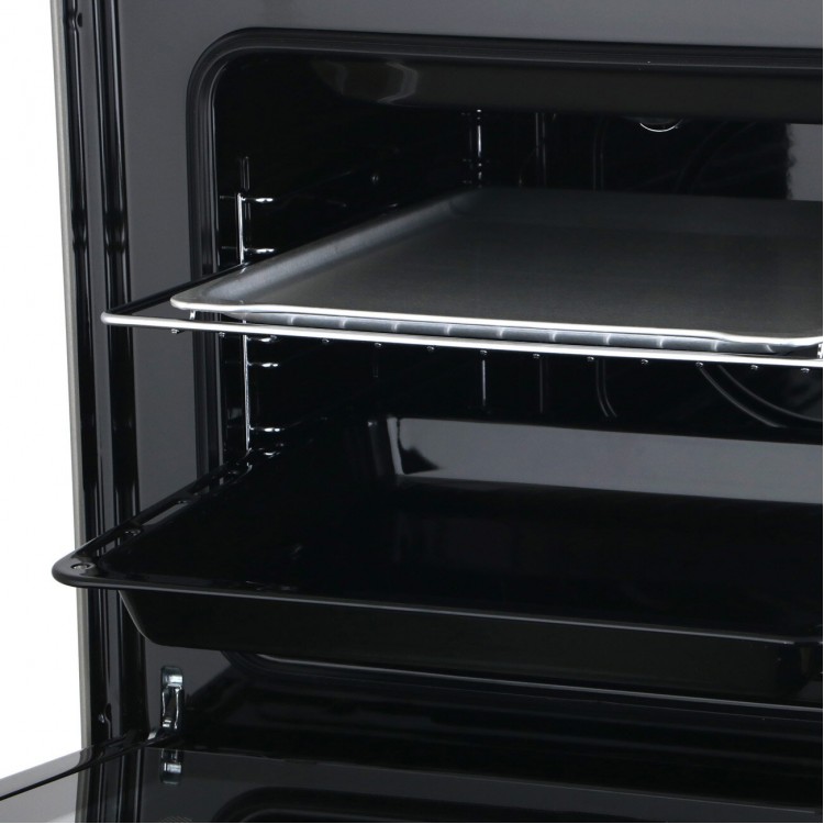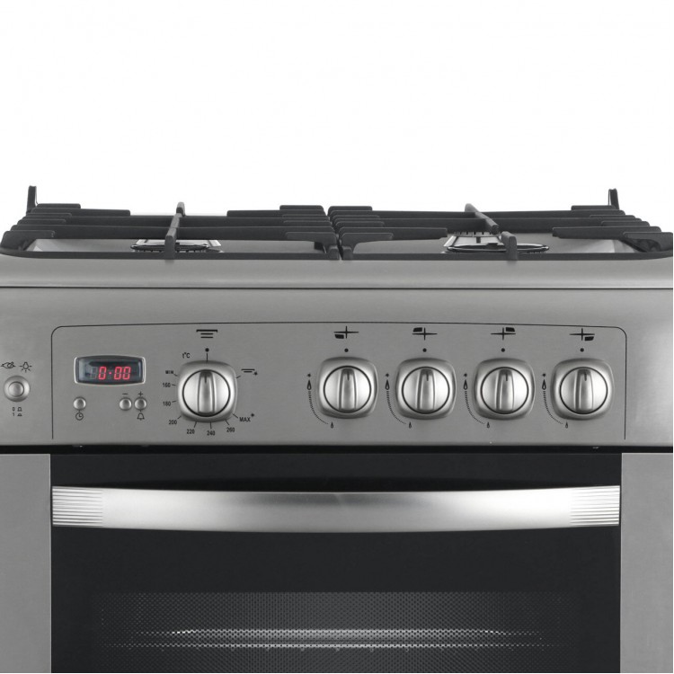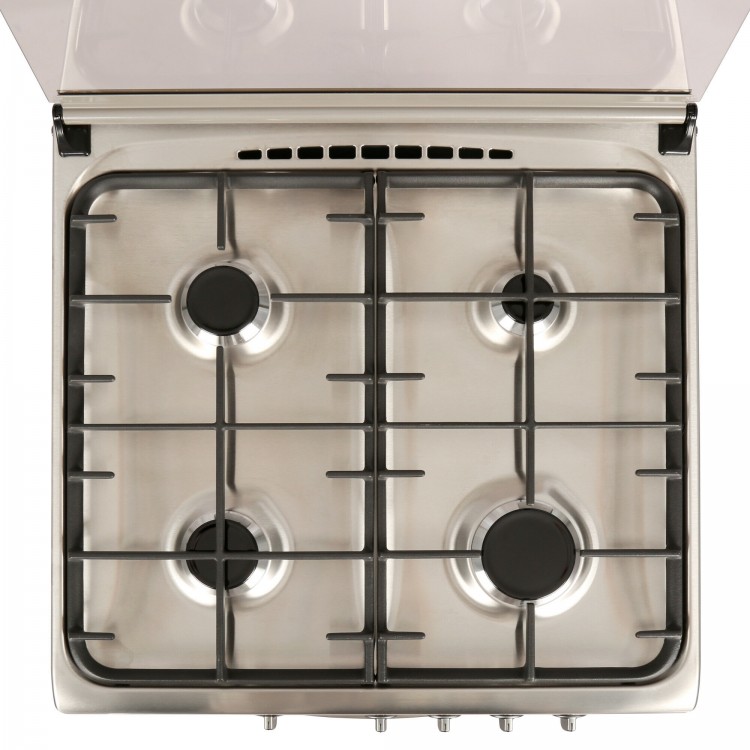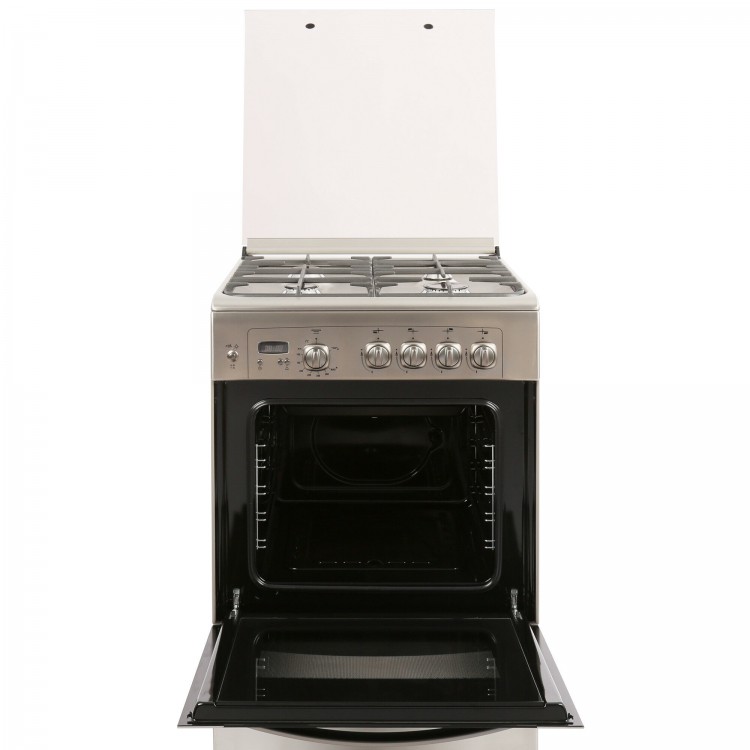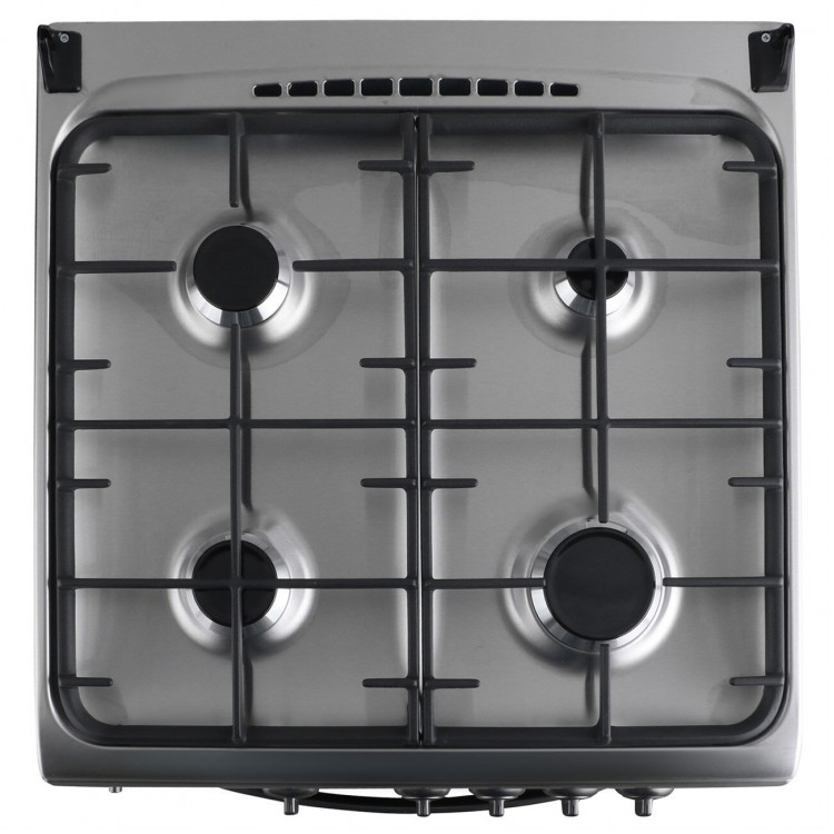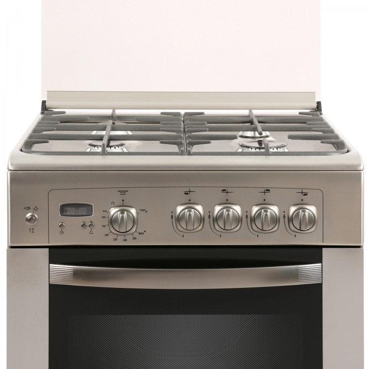 Материал рабочей поверхности – нержавеющая сталь, а тип духовки – газовая. Есть таймер и термостат, а также подсветка духовки и часы. Чугунные решетки и ящик для посуды – дополнительные преимущества этой модели.
