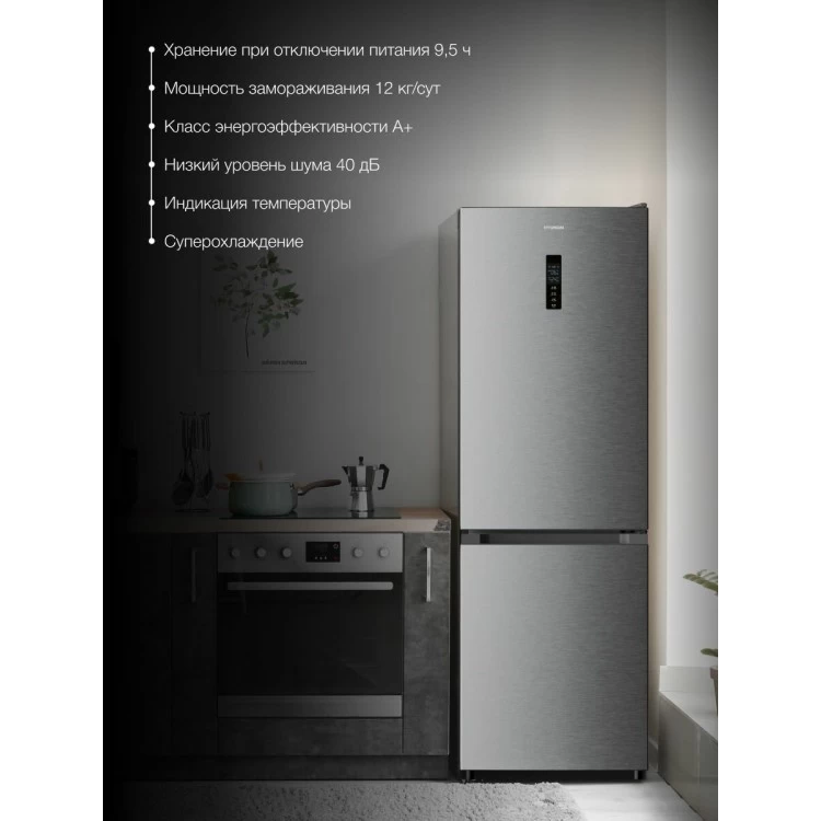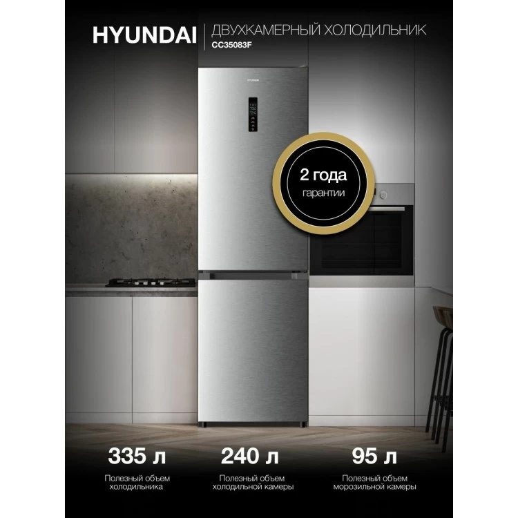 | Название | Холодильник Hyundai CC35083F 2-камерный, А+, 365 л общий объем, нерж сталь, No Frost, низкий уровень шума 40дБ, 10ч время поддержания температуры |