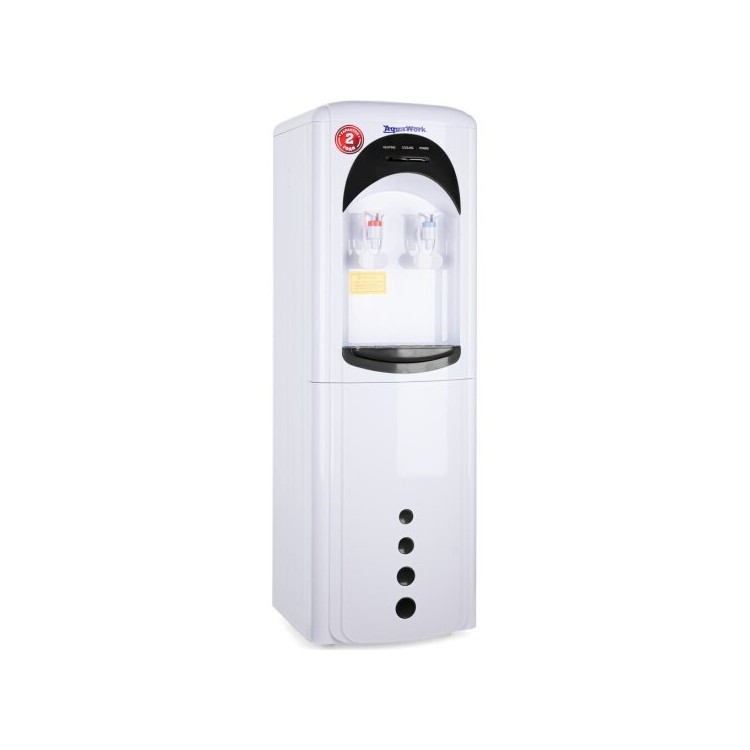 Приобрели в офис вместо Bioray wd3121, который отслужил верой и правдой более 10 лет и сломался. Достаточно легкий, без бутыля свободно перемещается хрупкими девушками) Внешне очень радует, установили на пол, оказался низковат, не очень удобно наливать, зато удобно менять бутыли)А вот напор при наливании слабее (бутылка 0,5-37 секунд). Хорошо подогревает и охлаждает, в штатном подогреве достаточная температура для чая и растворимого кофе. Охлажденная не прям лед, зубы не сводит, но холодная, освежает в душном офисе. Функция принудительного нагрева-супер! Использую её для заваривания кофе во френч-прессе, получается идеально! Пластиком не пахнет. Нижняя часть с полками достаточно удобна для хранения стаканов, чая, кофе (полка пластик, свиду хрупкая, но 2 кг кофе выдерживает) .Довольны. Спасибо за качестаенный товар.
