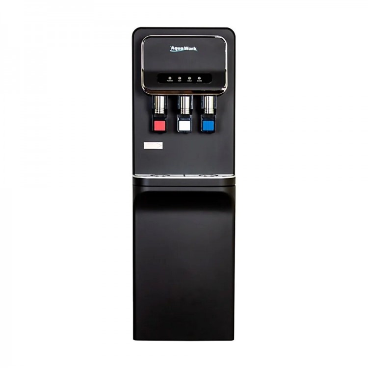 Быстро нагревает и охлаждает воду. Три кнопки подачи воды. Имеется ящик для хранения стаканов.
