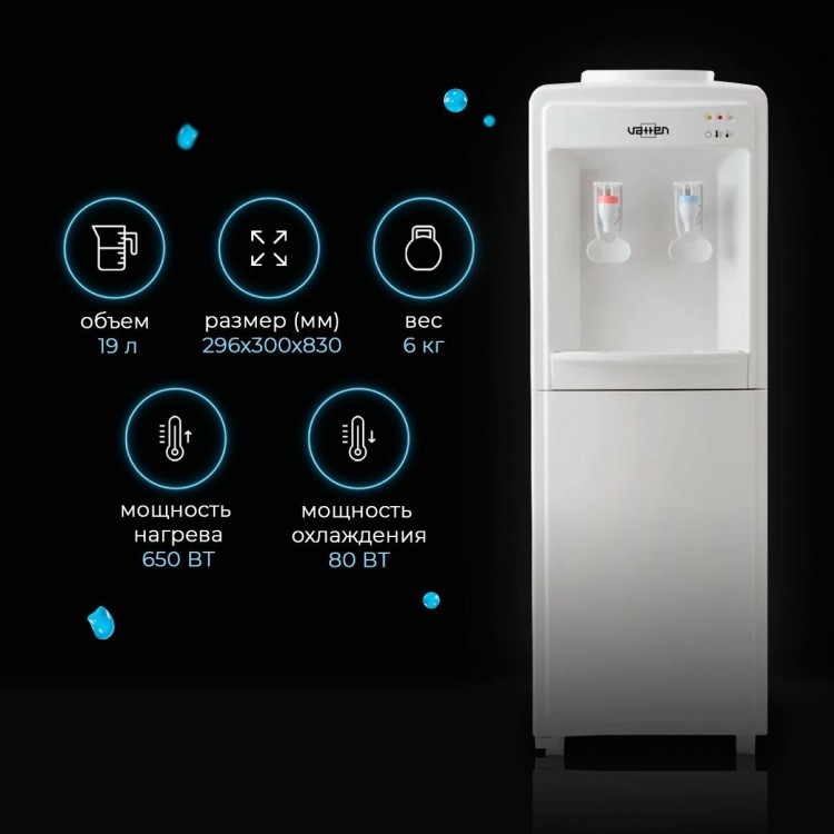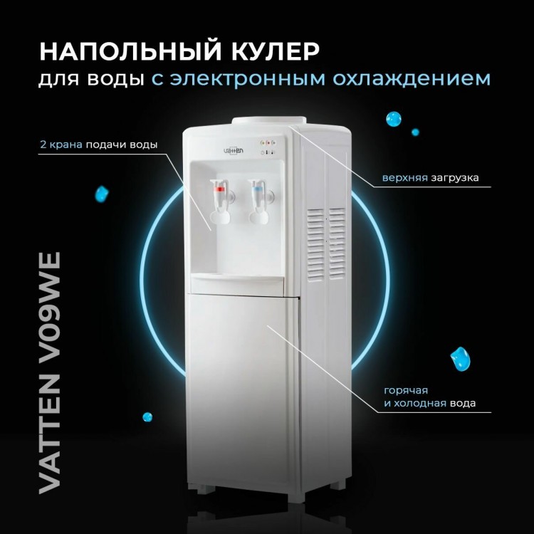 1. Выгодная цена. Доступная стоимость кулера Vatten V09WE делает его идеальным вариантом для тех, кто хочет приобрести качественный прибор по разумной цене.