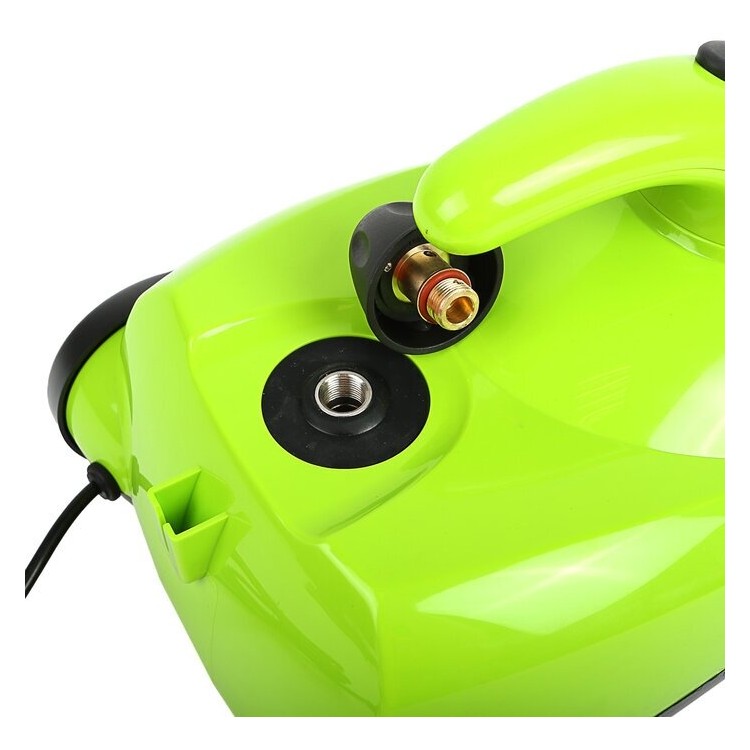 Высокое давление пара, много насадок и переходников, весёленькая расцветка, контейнер для мелких насадок