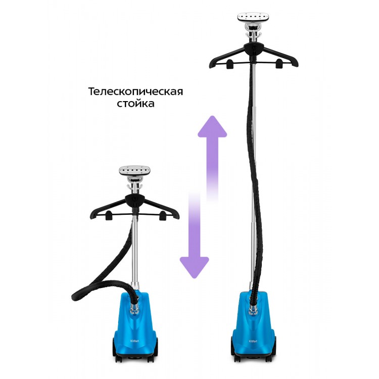 купила фиолетового цвета отпариватель Kitfort КТ9353Недорогой, мощный,объем бака для воды большой хватит на несколько курток.Подача пара 45 г/мин.Стойка регулируется по высоте.На вешалке есть зажимы для одежды.Легкий,на колёсиках