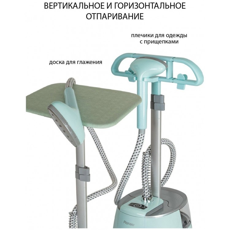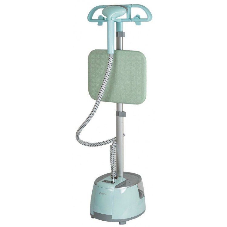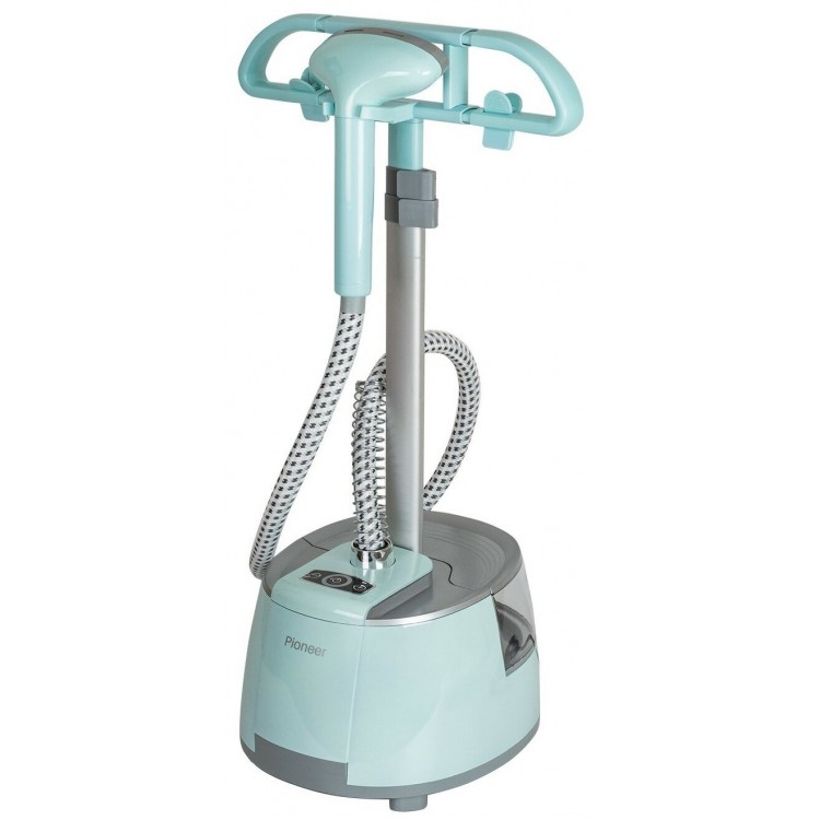 Название Отпариватель Pioneer SS203/SS201; Бренд Pioneer; Цвет товара бирюзовый/серебристый; Конструкция напольная; Мощность 2000 Вт; Максимальное давление пара 1 бар; Время нагрева воды 10 с; Максимальная подача пара 35 г/мин; Материал корпуса пластик; Температура пара 98 °C; Объем бака для воды 2.1 л; Объем бойлера 2.1 л; Особенности автоматическое выключение, предохранительный клапан, регулировка подачи пара, Автоотключение, Вертикальное отпаривание; Дополнительные функции горизонтальное отпаривание; Особенности конструкции ручка для переноски, съемный резервуар для воды, телескопическая стойка, 28669108, напольный; Насадки насадка-зажим, щетка; Минимальная высота телескопической стойки 75 см; Максимальная высота телескопической стойки 148 см; Дополнительная информация отпариватель, доска для глажения, гибкий шланг в защитной оболочке, насадка для отпаривания, плечики для одежды с прищепками для брюк и юбок, перчатка, гарантийный талон, инструкция на русском языке; Длина парового шланга 1.3 м; Длина сетевого шнура 1.48 м; Ширина 23.4 см; Высота 19.4 см; Глубина 26.5 см; Вес 5 кг; Гарантийный срок 1 г; Цвет бирюзовый/серебристый;