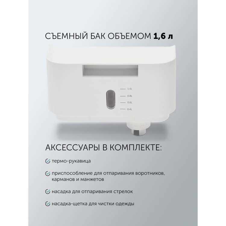 Комплектация. 2 терморукавицы (чтобы не обжечься), насадка для отпаривания стрелок (ее использует муж для своих брюк), насадка-щетка для чистки одежды и приспособление для отпаривания воротников, карманов и манжетов. Пользуемся регулярно, еще не подводил