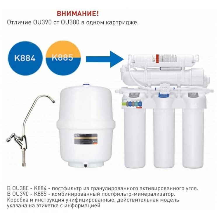 Дополнительная информация1. Фильтр обратного осмоса с минерализацией OU390 — 1 шт. 2. Бак для чистой воды премиального качества объемом 3.2G (12 л. - общий объем / 6-8 л. чистой воды) — 1 шт. 3. Кран для чистой воды — 1 шт. 4. Аксессуары для установки — 1 комплект
