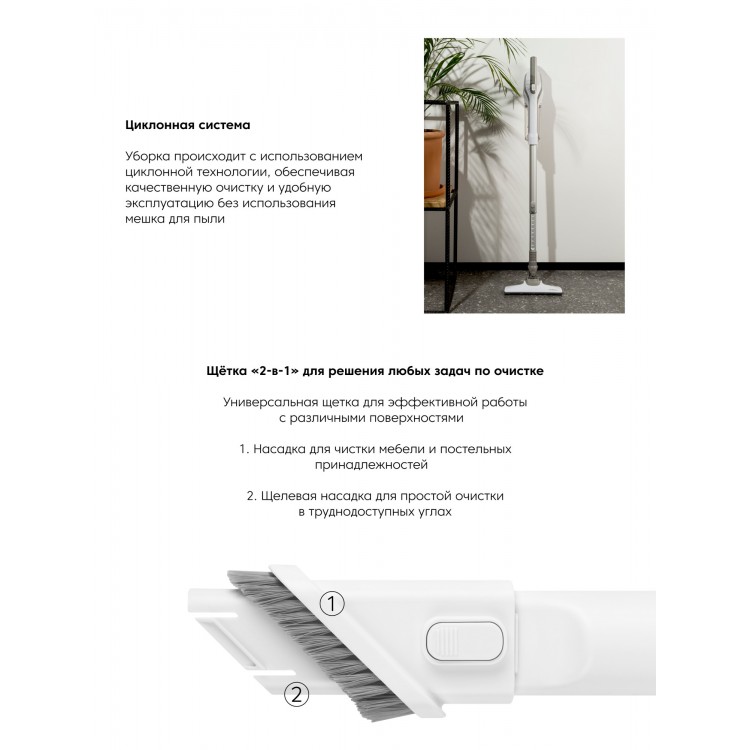 * Два режима уборки, турборежим и насадка для вычёсывания домашних животных, которые сделают вашу уборку ещё более эффективной.