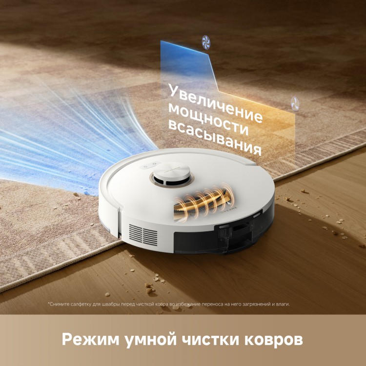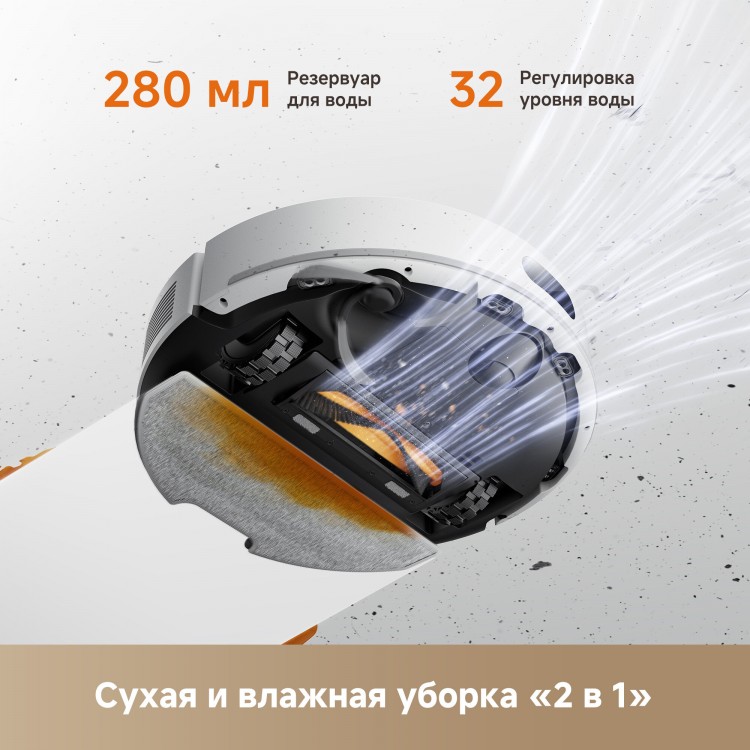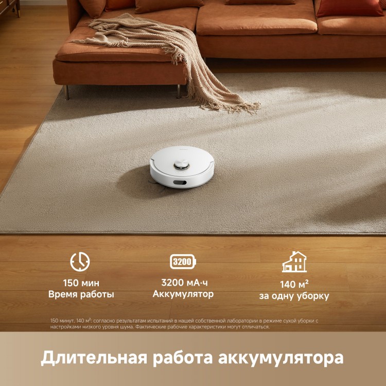 В комплекте с пылесосом вы получите боковую щётку и зарядное устройство. Робот-пылесос работает от Li-Ion аккумулятора и может убираться до 150 минут без подзарядки. Время зарядки составляет 240 минут. Объём контейнера для пыли — 3 литра, для воды — 0,28 литра. Пылесос работает в системе «Умный дом» через Wi-Fi.