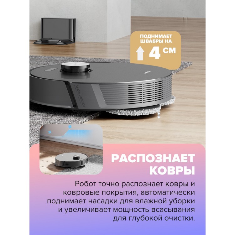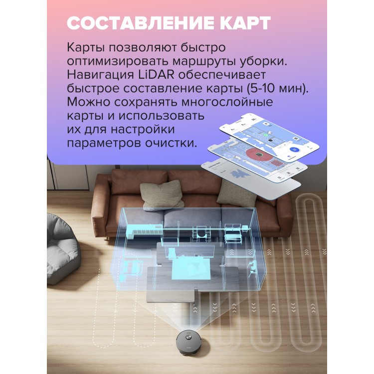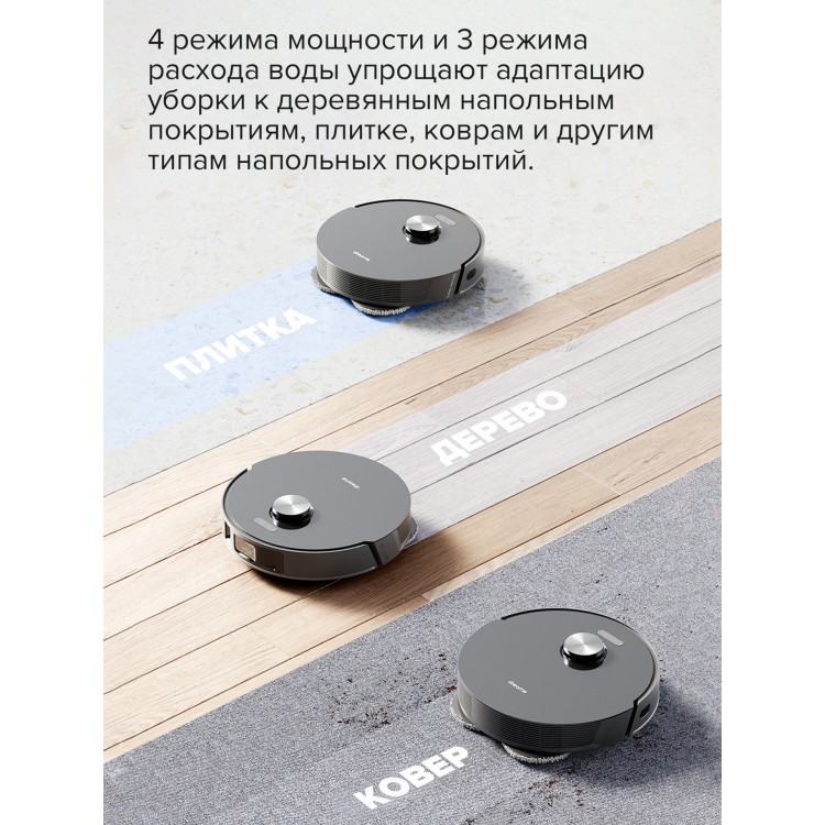 В Dreame L10s Pro предусмотрено несколько режимов работы, включая быструю уборку, движение вдоль стен и движение зигзагом. Вы также можете задать точечную уборку и включить турборежим для особо загрязнённых участков.