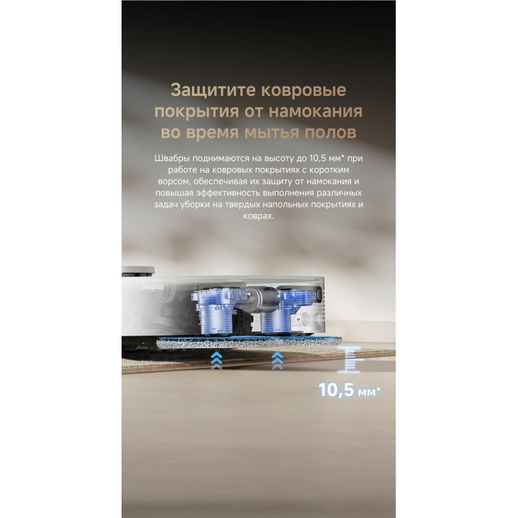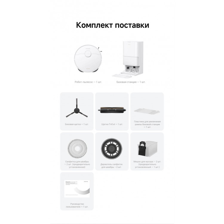 | В комплекте | Боковая щетка, Робот-пылесос, базовая станция, мешок для мусора (1 установлен), пластина для увеличения базовой станции, руководство пользователя, чистящее средство (200 мл), швабра для влажной уборки с держателем- 2 шт., щетка TriCut для срезания волос |