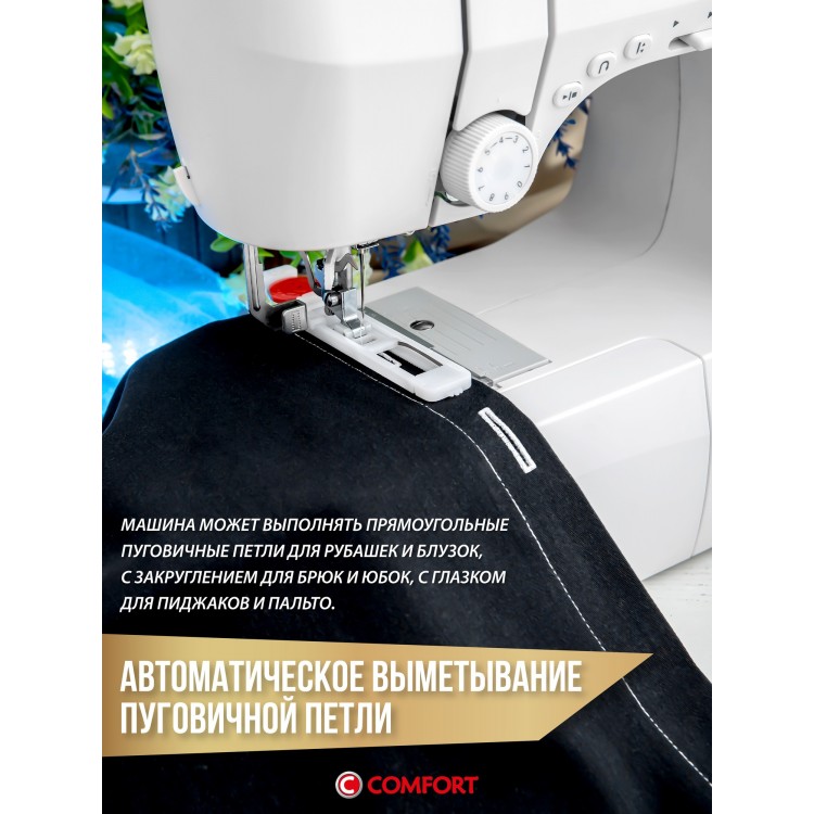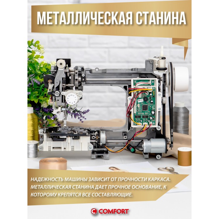 COMFORT 1001 от бренда COMFORT. Это компьютеризированная швейная машина с ротационным горизонтальным челноком, которая предлагает широкий набор функций и возможностей для шитья.