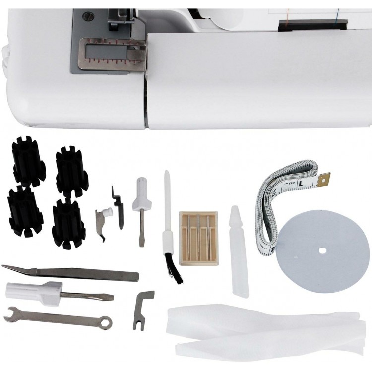 | Комплектация | Мягкий чехол; Набор игл; Пинцет; Щеточка для очистки; Катушка с нитками x4; Сетка для катушки x4; Отвертка x2; Лапка стандартная; Масло для смазки; Ключ для замены игл; Катушкодержатели x4; Чехол |