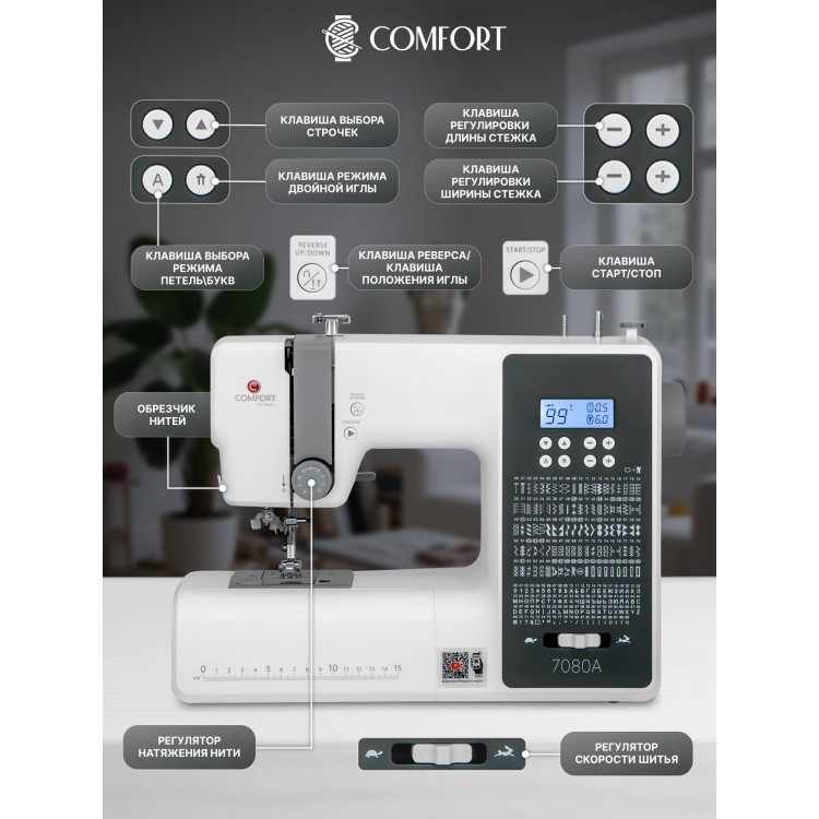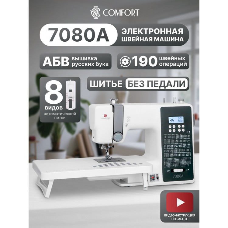 | Название | Швейная машина Comfort 7080A, 190 операций, 8 видов петель, нитевдеватель, дополнительный столик. |