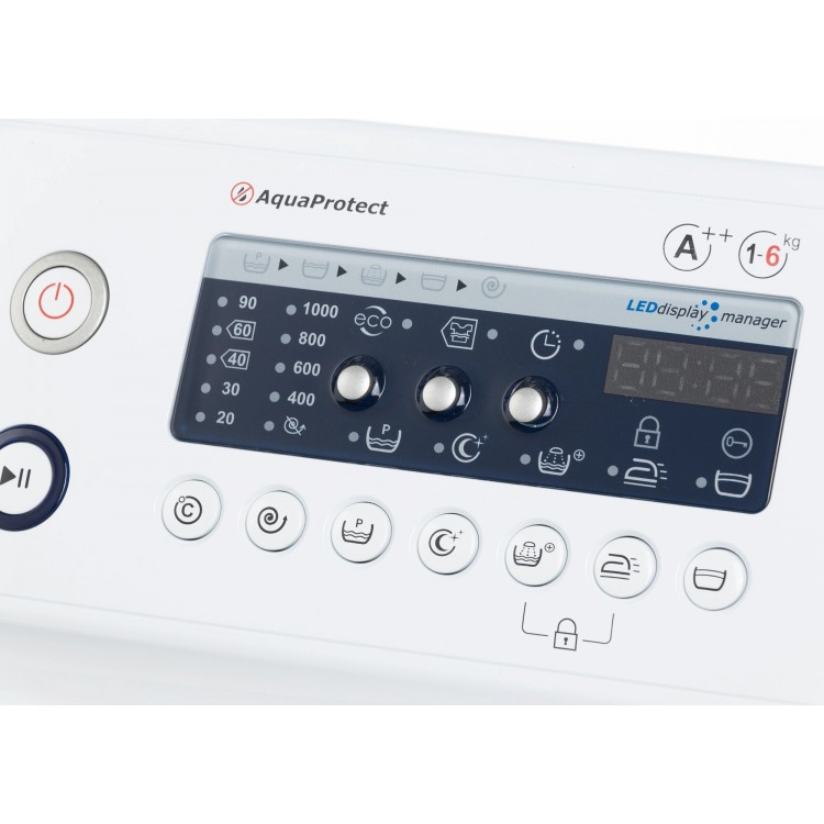 - Фронтальная загрузка и максимальная вместимость 6 кг позволяют стирать большое количество белья за один цикл.