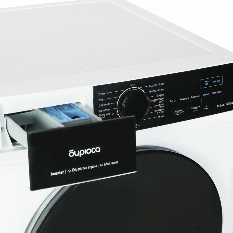 Стиральная машина Бирюса WM-SN1014/15 имеет защиту от детей, рельефную поверхность и сотовый барабан. Диаметр загрузочного люка — 36,3 см.