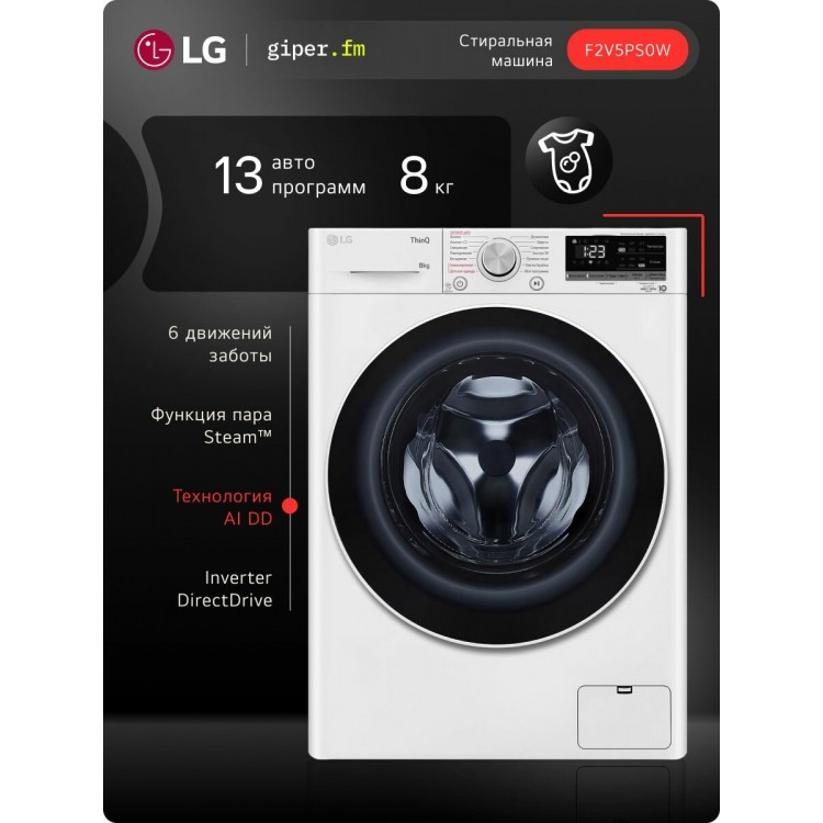 | Название | Стиральная машина LG F2V5PS0W 8 кг, инверторный мотор с прямым приводом, функция пара Steam, интеллектуальное распознавание ткани AI DD, 13 программ, для аллергиков и детской одежды, белый |